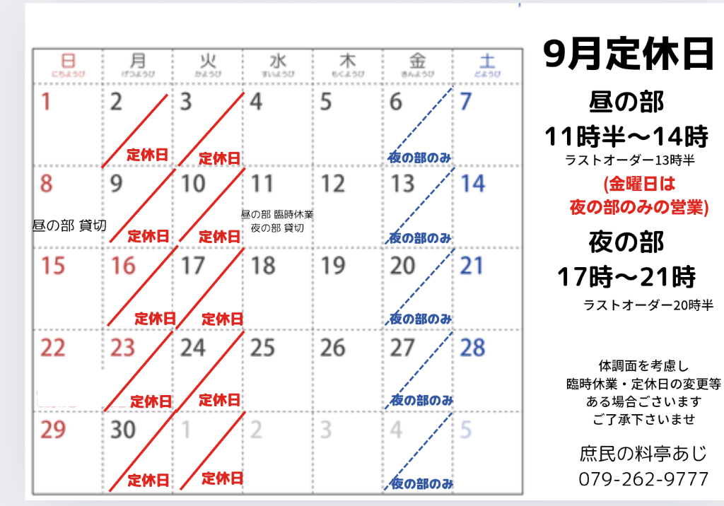 9月定休日ご案内