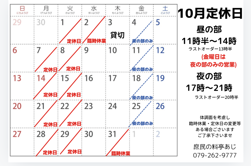 10月定休日のお知らせです