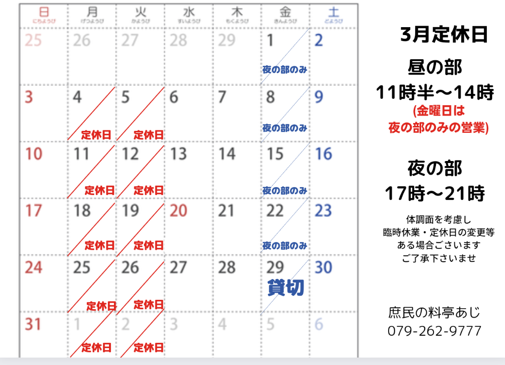 #姫路グルメ#姫路ランチ#姫路デイナー#庶民ほ料亭あじ#3月の定休日