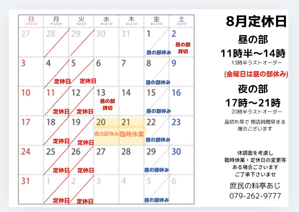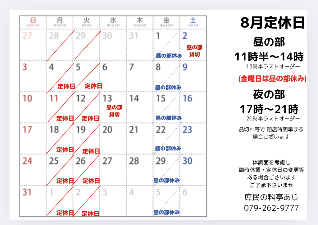 #8月定休日ご案内