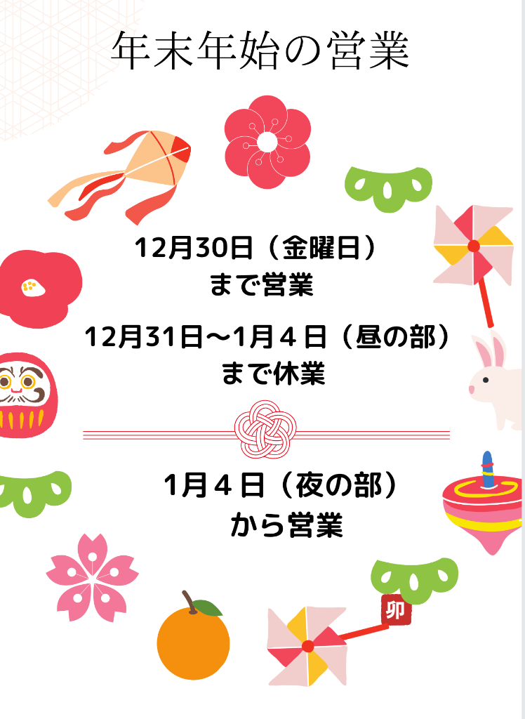 🐅12月31日(土曜日)〜1月4日(水曜日)昼の部まで休業